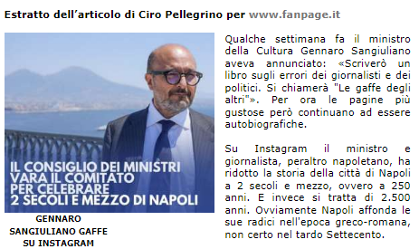 Una gaffe particolarmente imbarazzante per il Ministro: perché ovviamente le celebrazioni di un anniversario così importante della sua città gli stanno particolarmente a cuore. E ridurne le origini alla seconda metà del Settecento taglia tra le innumerevoli cose anche il più antico teatro lirico d'Europa, il San Carlo (1737), che è stato oggetto di tante sue attenzioni.